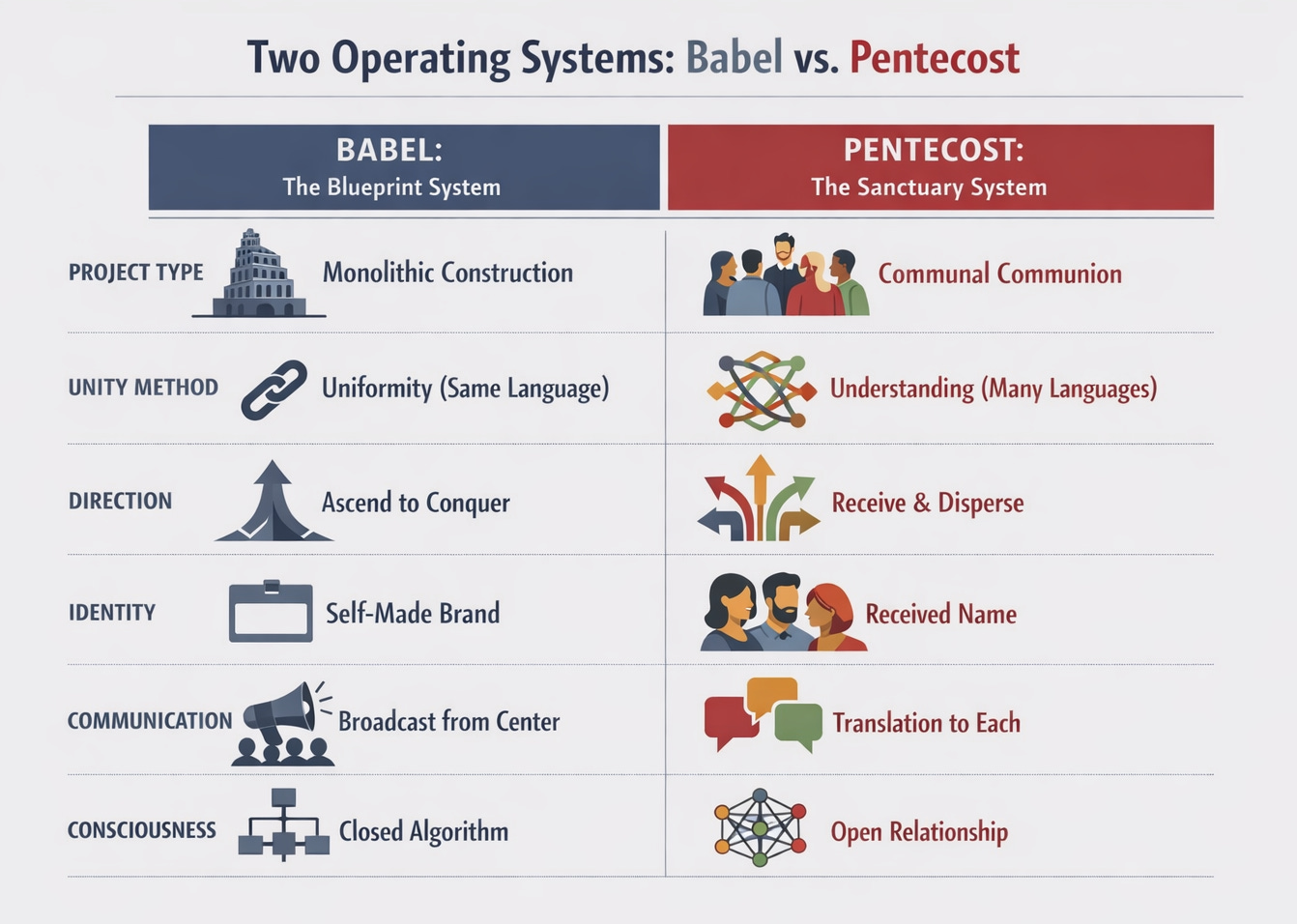 If Babel is the archetype of the Builder’s fire—the controlled kiln baking uniform bricks—then its antithesis is Pentecost.
